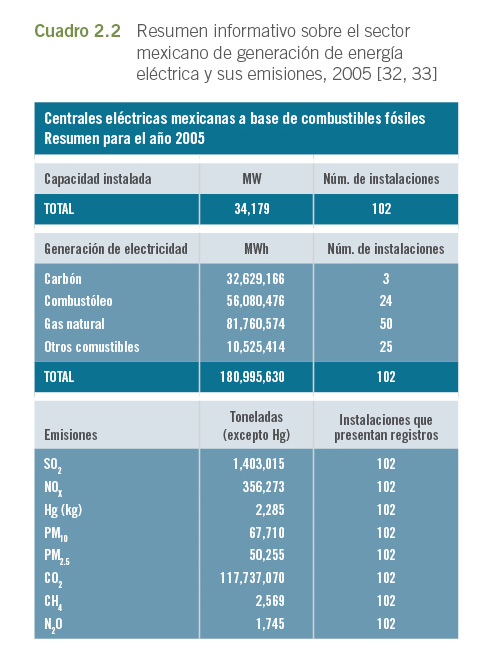 En este informe se incluyeron 102 centrales eléctricas de México; 31 de ellas eran propiedad de productores independientes de energía (PIE) que ya notificaban sus emisiones mediante la COA. En el cuadro 2.2 se presenta un resumen de la información de estas centrales.