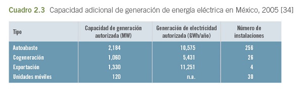 Además de los datos que aparecen en el cuadro anterior, en el cuadro 2.3 se muestra que la capacidad de generación adicional y la generación de energía eléctrica estaban autorizadas para generadores privados con fines de autoabasto, cogeneración y exportación, cuyas emisiones no pudieron calcularse para este informe por falta de datos. Además, la CFE estaba autorizada para operar algunas plantas móviles sobre las que no hubo información adicional.