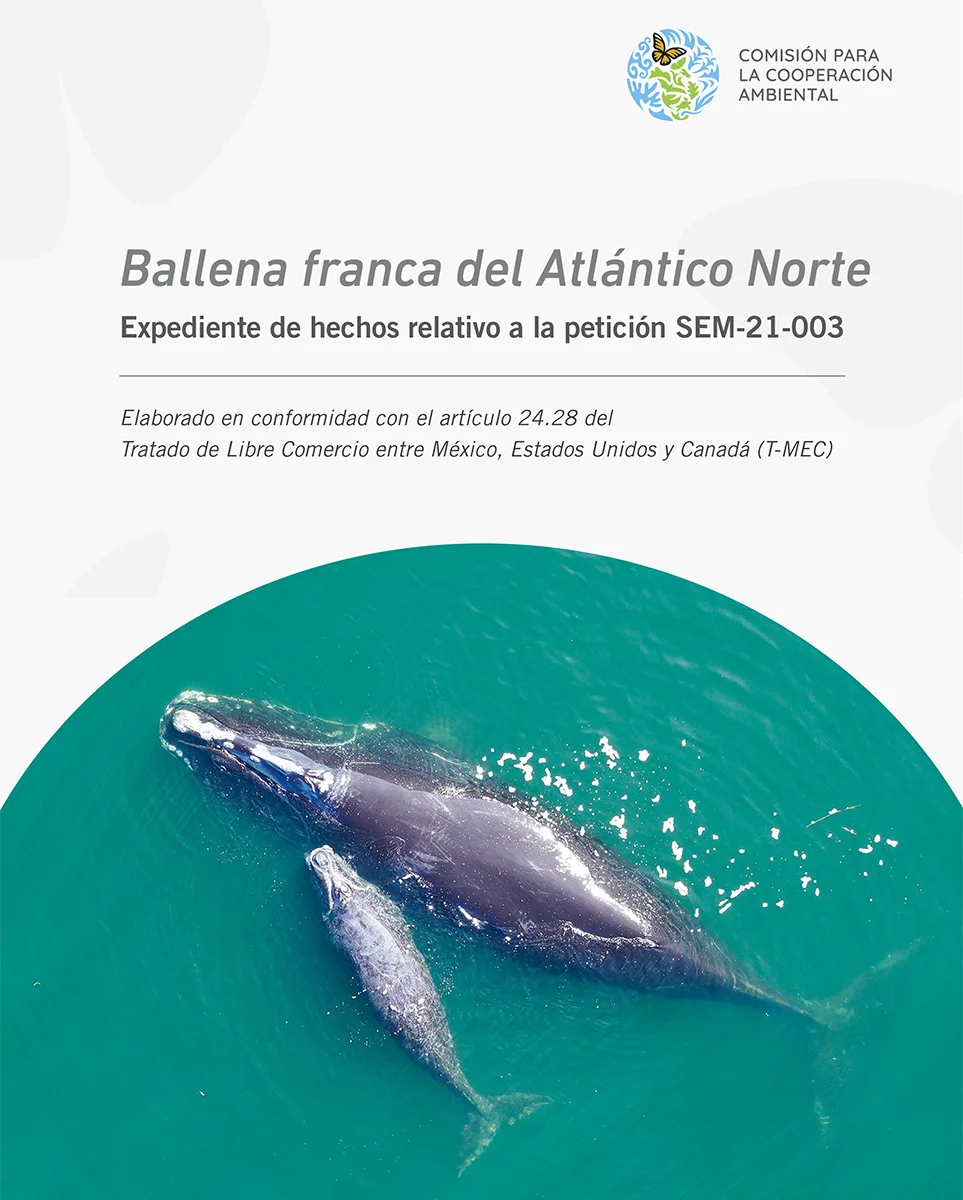 El presente expediente de hechos aborda las aseveraciones planteadas en la petición SEM-21-003 sobre las presuntas omisiones en que Estados Unidos está incurriendo en la aplicación efectiva de sus leyes ambientales respecto a la ballena franca del Atlántico Norte (Eubalaena glacialis), especie en peligro de extinción. El Secretariado de la CCA elaboró el expediente de hechos con apego a la autorización del órgano rector de la CCA en su Resolución de Consejo 25-01 y de conformidad con el artículo 24.28 del T-MEC.