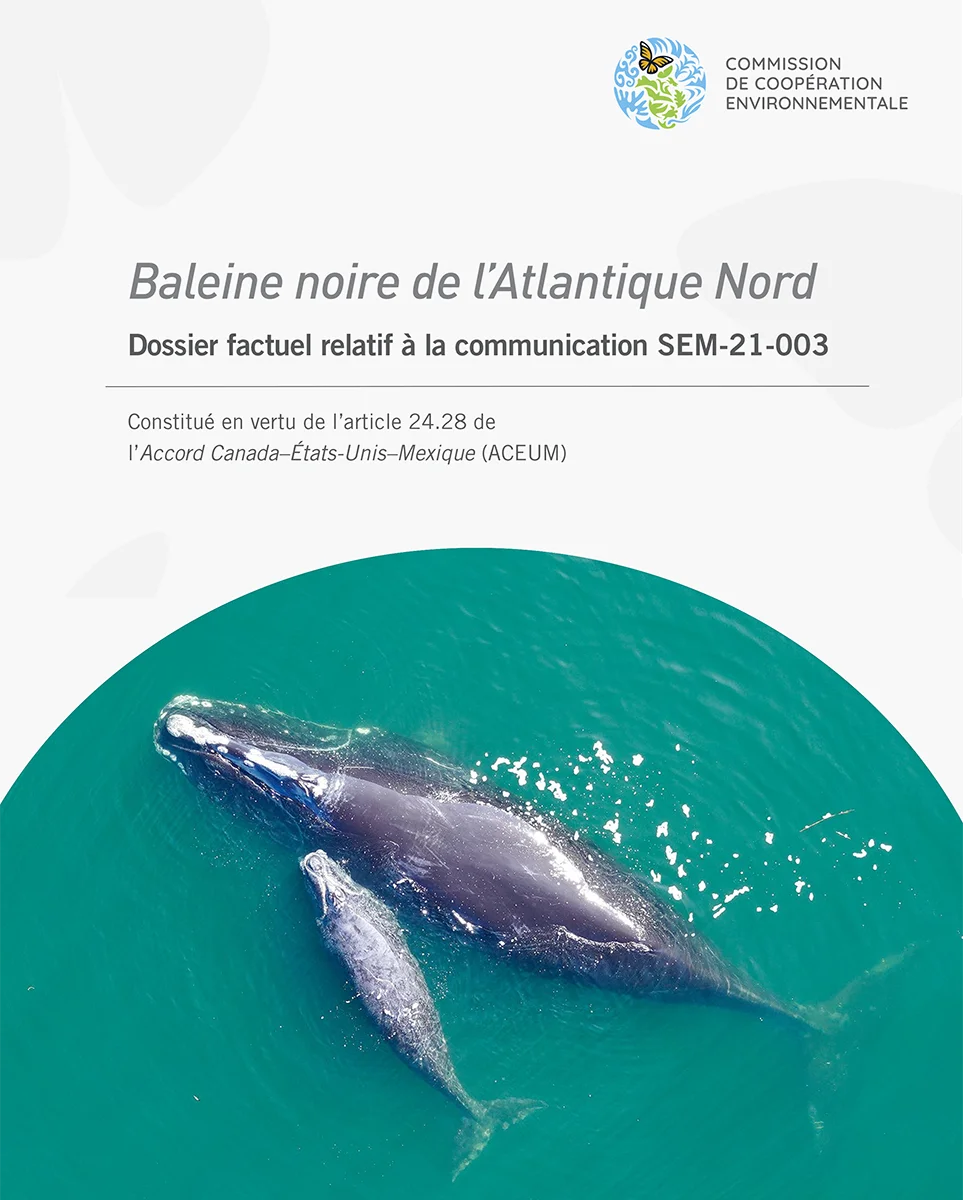 Le présent dossier factuel traite des allégations soulevées dans la communication SEM-21-003 concernant la baleine noire de l’Atlantique Nord (Eubalaena glacialis), espèce en voie de disparition, comme l’ont autorisé les membres du Conseil de la CCE dans la Résolution du Conseil no 25-01. Ce dossier factuel a été préparé par le Secrétariat de la CCE conformément à l’article 24.28(5) de l’ACEUM, à la suite d’une communication alléguant que les États-Unis omettent d’assurer l’application effective de leurs lois environnementales.